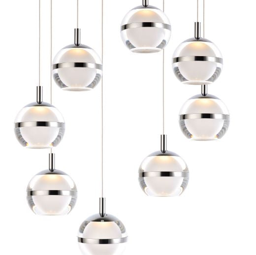 Orbs of crystal Clear acrylic are trimmed with a Polished Chrome band and frosted inside for excellent light diffusion. The bottom is dimpled for a unique optical effect.