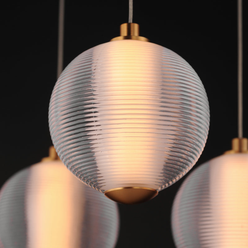 Ablaze with omnidirectional LED light radiating from the center of perfectly ribbed spheres, the lustrous glow within accentuates the repeating pattern on the glass' exterior. With minimal hardware visible outside the glass, select from Polished Chrome or Gold to match your interior's decor.