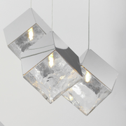 Like melting ice, these oversized cube pendants support cast glass shades from highly polished stainless steel frames. Select from two finish combinations: a Clear glass shade and Polished Chrome frame or soften the look with warm Amber glass and a polished French Gold frame. Available in a variety of configurations, these pendants will make your space cool.