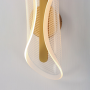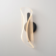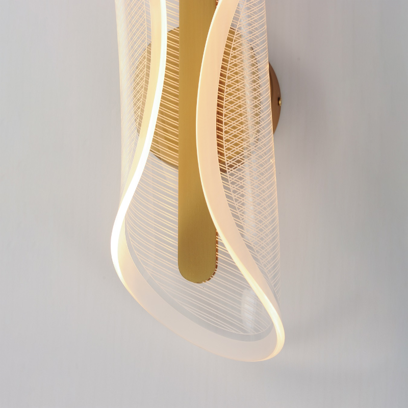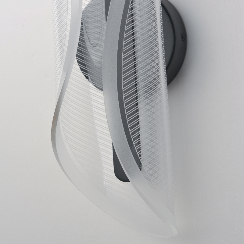 An undulating shape softly curls along its center to create an organic form constructed of a single panel of transparent acrylic. Further enhancing the form is the captivating effect of the frosted band around the borders and the patterned etching on the acrylic that captures the light.
