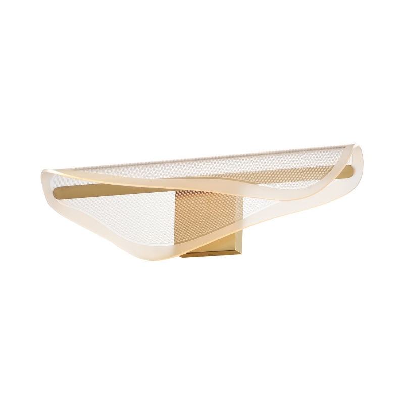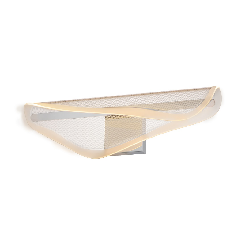 An undulating shape softly curls along its center to create an organic form constructed of a single panel of transparent acrylic. Further enhancing the form is the captivating effect of the frosted band around the borders and the patterned etching on the acrylic that captures the light.