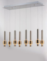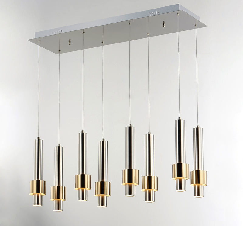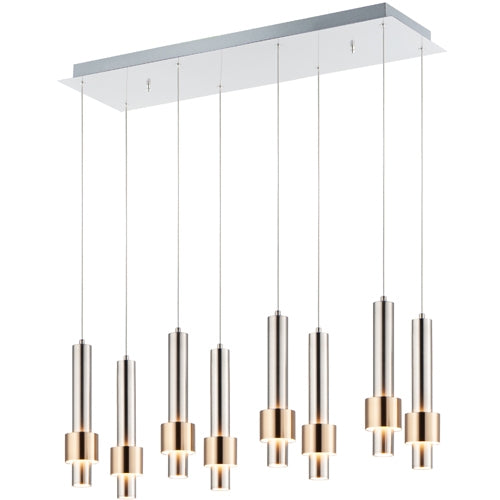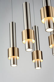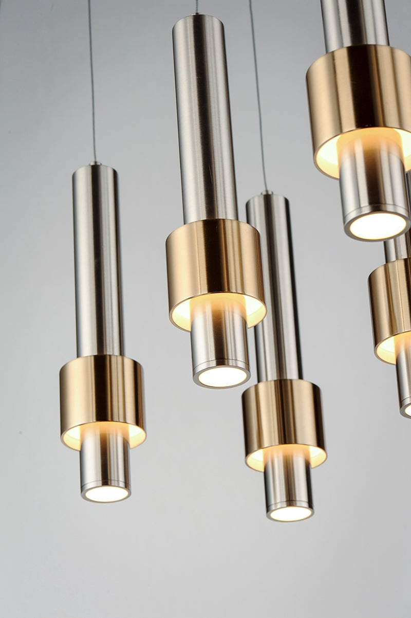 Tubular shaped pendants finished in Satin Nickel with a Satin Brass band provide light from the bottom as well as a reveal behind the band. The soft glow of light from the band creates a beautiful lighting effect not normally seen from similar pendants.