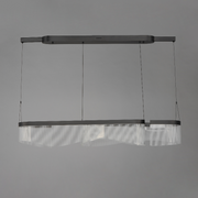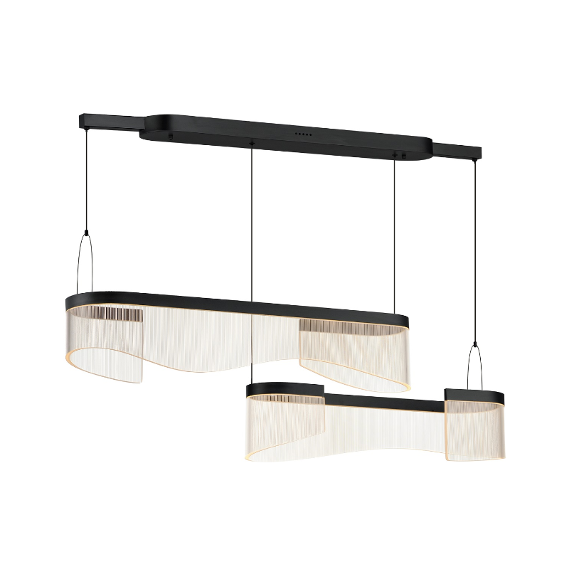 Composed of gently curving aluminum channels in Matte Black that support a patterned translucent acrylic arranged in groups of vertical stripes, this series of pendants and coordinating ADA sconce express a musical quality in brilliant LED light. The wall sconce visibly suggests the shape of a piano, while the pendants return inward where they bend at the ends in an instrumental, elegant shape. A story told in simple forms, the collection is illuminated by dedicated LED light sources concealed within the frames enhancing the translucent undulating slabs of patterned acrylic. Their sculptural form is sure to add wonder to both classical and modern settings.