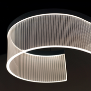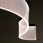 Composed of gently curving aluminum channels in Matte Black that support a patterned translucent acrylic arranged in groups of vertical stripes, this series of pendants and coordinating ADA sconce express a musical quality in brilliant LED light.