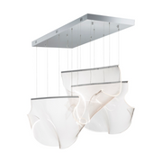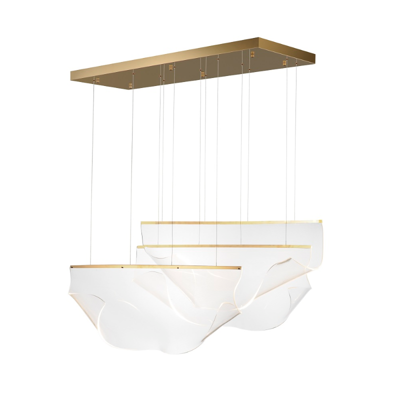 An airy arrangement of abstract forms, the Rinkle pendants feature sheets of transparent acrylic shaped by hand. The light guided acrylic captures the glow of energy efficient LEDs recessed within strips of shining stainless steel, obscuring the source of illumination. Delicately suspended by a series of thin wires, the pendants appear to be floating in an adjustable configuration of weightless light sculpture. Available in Polished Chrome, French Gold, and Brushed Gunmetal, its unique design adds a showstopping element to interior spaces.