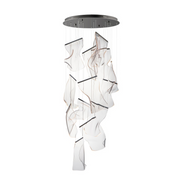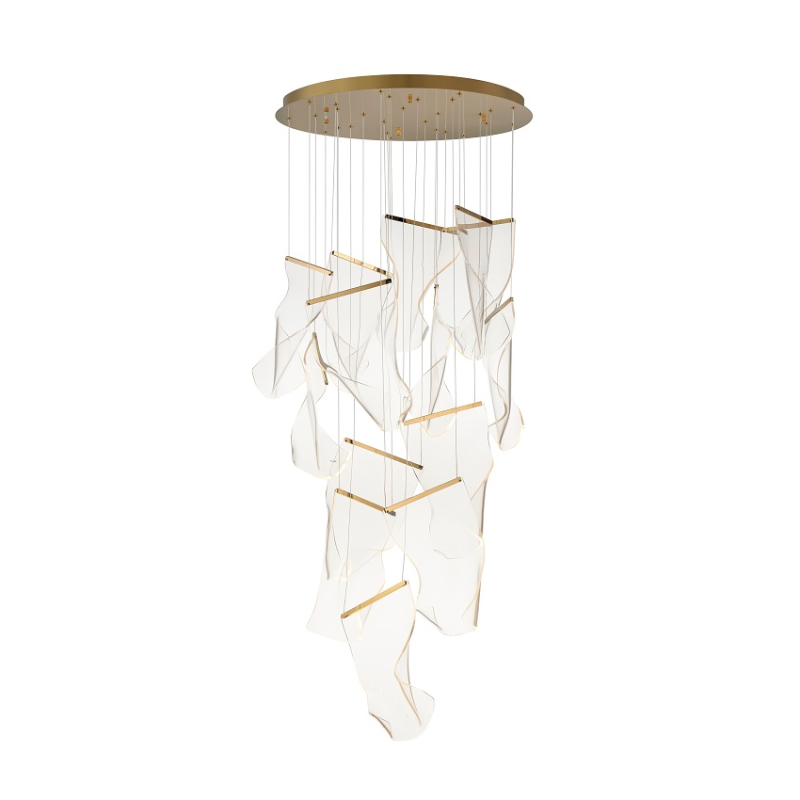 An airy arrangement of abstract forms, the Rinkle pendants feature sheets of transparent acrylic shaped by hand. The light guided acrylic captures the glow of energy efficient LEDs recessed within strips of shining stainless steel, obscuring the source of illumination. Delicately suspended by a series of thin wires, the pendants appear to be floating in an adjustable configuration of weightless light sculpture. Available in Polished Chrome, French Gold, and Brushed Gunmetal, its unique design adds a showstopping element to interior spaces.