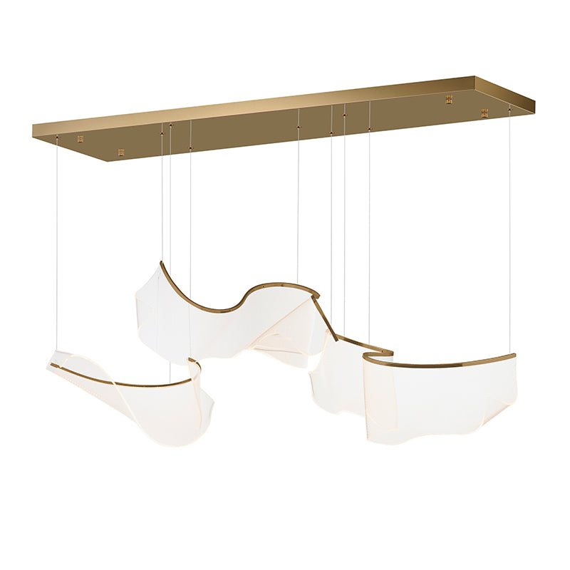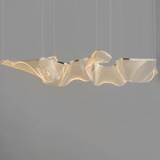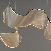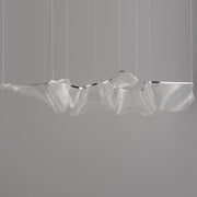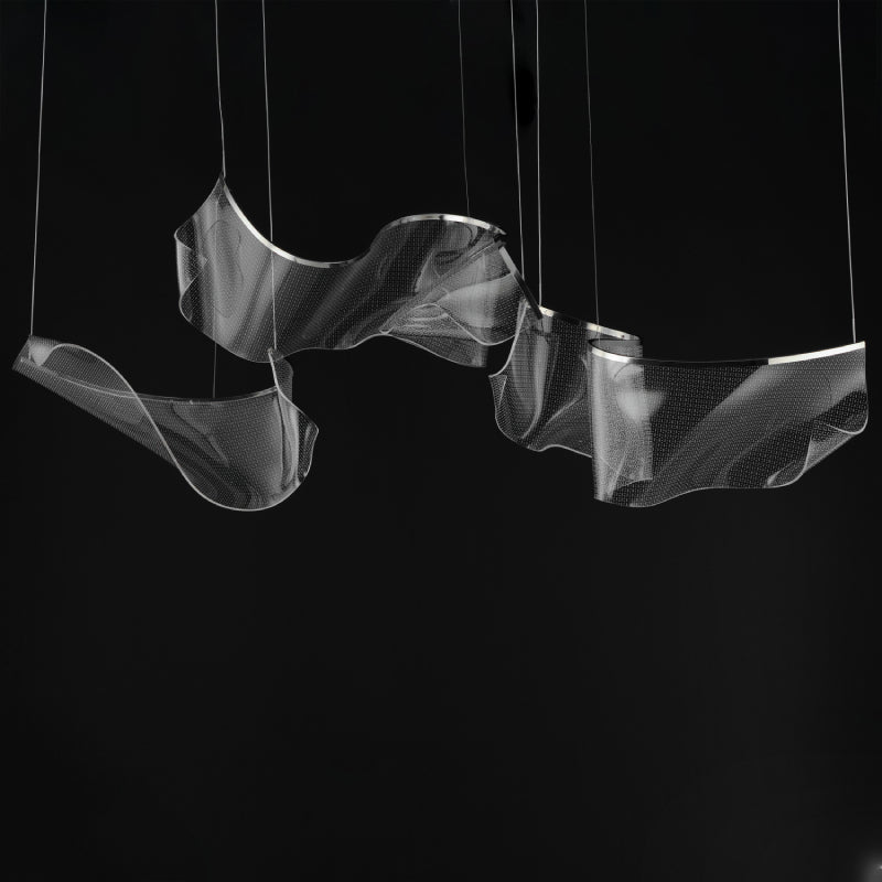 An airy arrangement of abstract forms, the Rinkle pendants feature sheets of transparent acrylic shaped by hand. The light guided acrylic captures the glow of energy efficient LEDs recessed within strips of shining stainless steel, obscuring the source of illumination. Delicately suspended by a series of thin wires, the pendants appear to be floating in an adjustable configuration of weightless light sculpture.