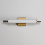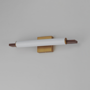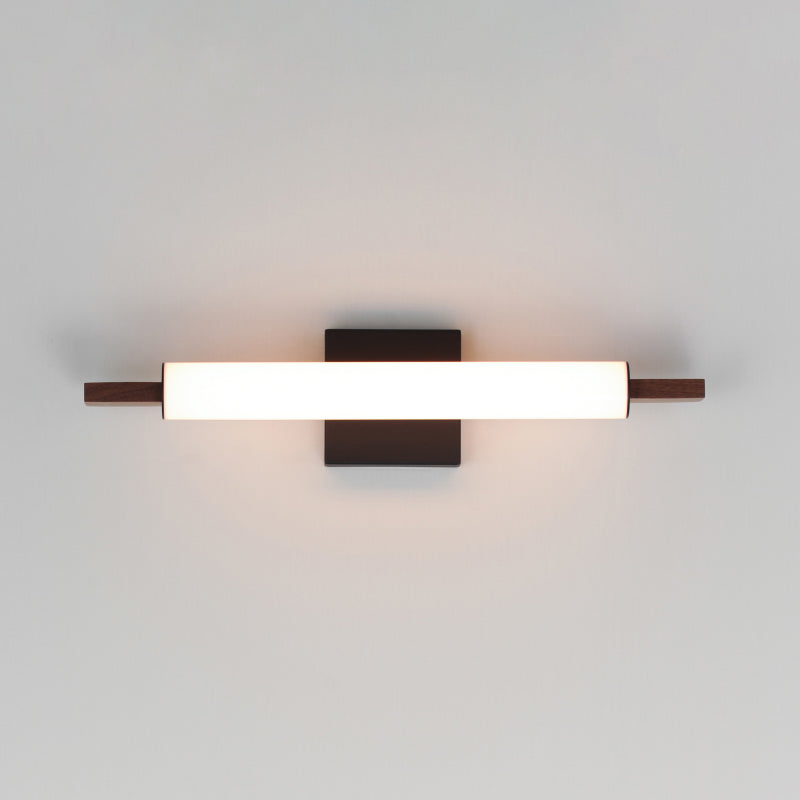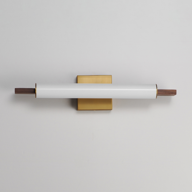Horizontal Spans of natural wood frame an evenly diffused LED omnidirectional light source. Choose from genuine Walnut with Black or Natural Aged Brass accents or solid oak in a hand-applied Driftwood finish.