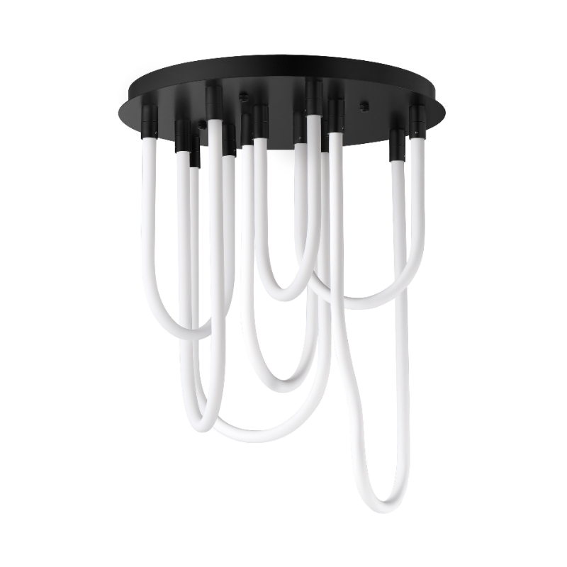 Sweeping matte white acrylic tubes encase an omnidirectional LED light source, arranged in abstract configurations inspired by solar flares. Minimal in composition yet dramatic in form, the Soleil collection offers a striking lighting solution.