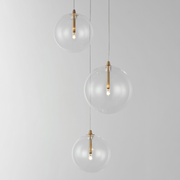 An airy configuration of Clear blown glass globe shades in various sizes suspend on thin low voltage wires. Thin tubes finished in Black or Gold descend into the center of the globes where a small G4 LED lamp provides a spark of light.