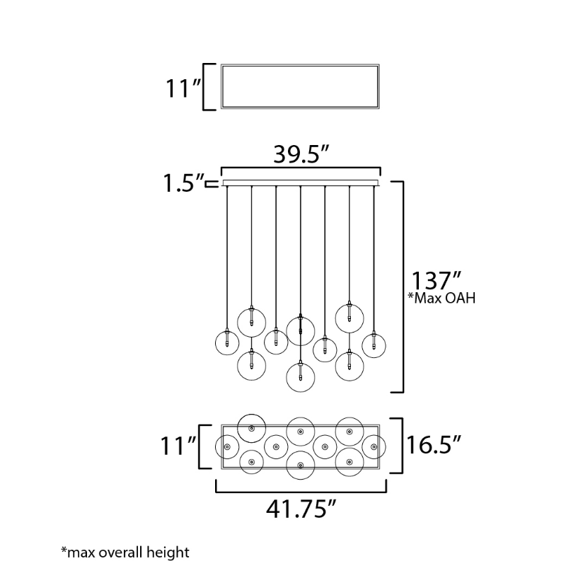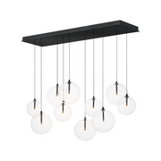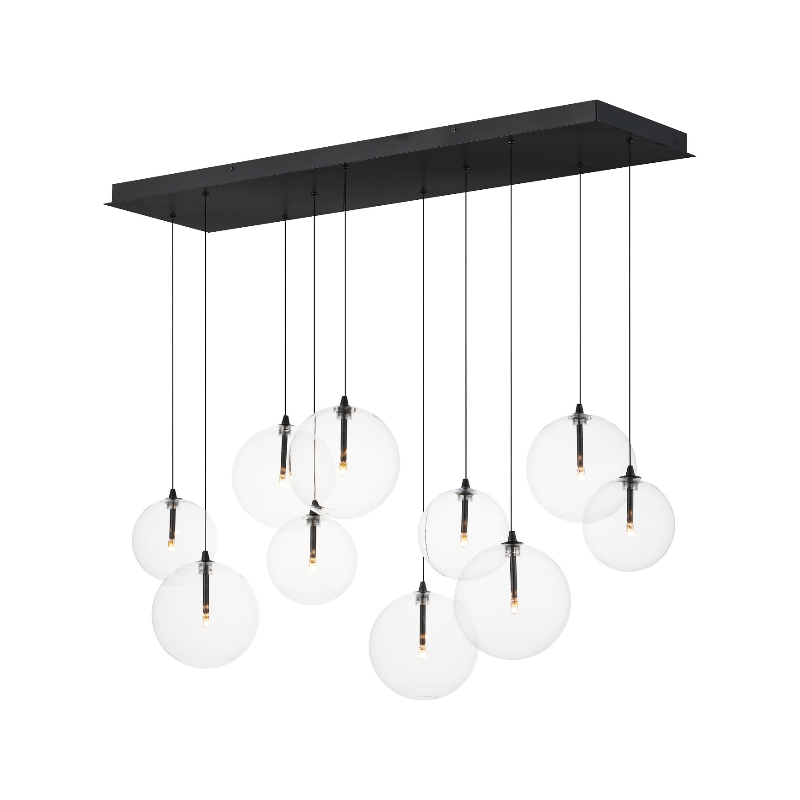 An airy configuration of Clear blown glass globe shades in various sizes suspend on thin low voltage wires. Thin tubes finished in Black or Gold descend into the center of the globes where a small G4 LED lamp provides a spark of light.