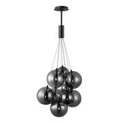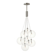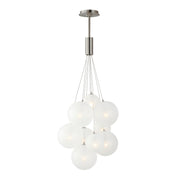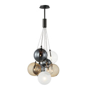 Clusters of glass globes in various sizes and color are suspended from a central point and burst outward. Configurations can be mounted close to the ceiling or included down rods to extend the height.