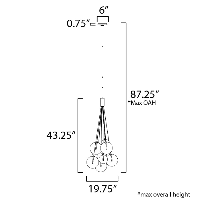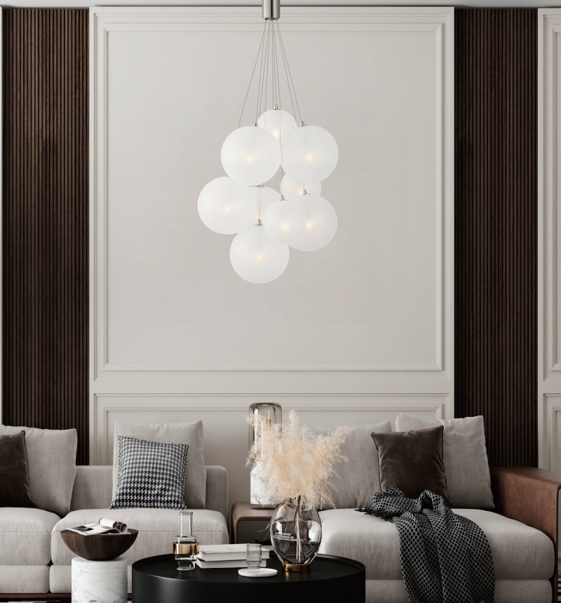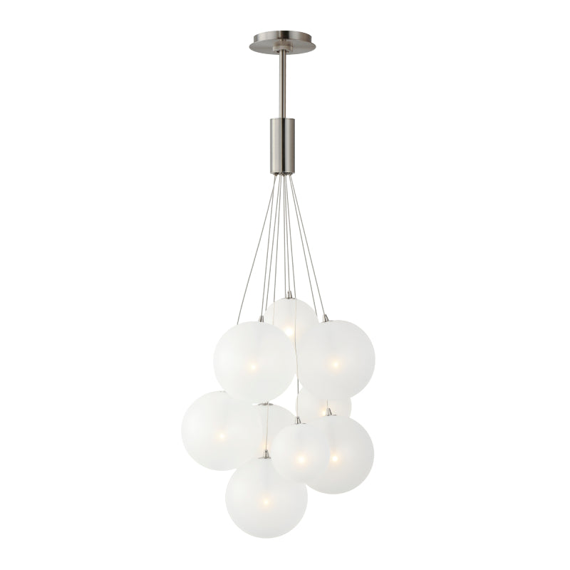 Choose from options of Clear or Frosted glass globe clusters paired with Satin Nickel frames for an airy transitional design or be bold with Mirror Smoked glass or a varied combination of the glass including amber tinted suspended on a Matte Black frame with thin black cables.