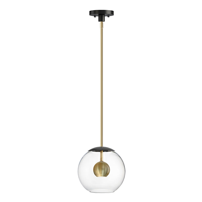 Three sizes of thick Clear glass orbs are suspended displaying a small aluminum sphere encompassed within. Discretely recessed dedicated LED provides ample lighting without glare.