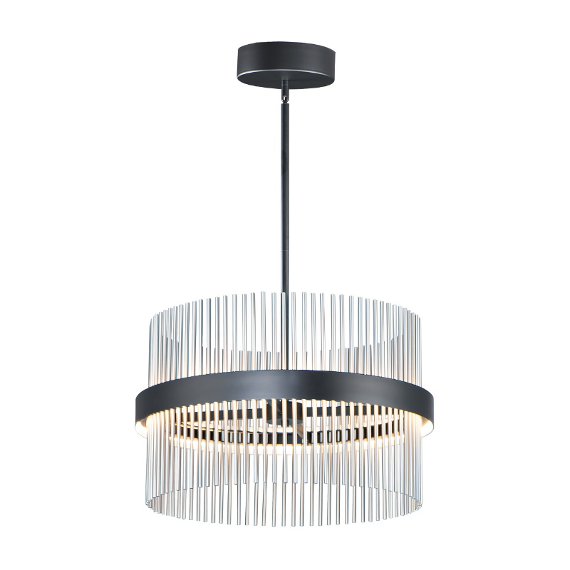 Wide bands of Matte Black metal supports an evenly spaced row of thin tubing finished in your choice of Satin Brass, Satin Nickel or a combination of the two. Marvel at the ring's soft indirect lighting dispersion cast light both up and down and shine along the tubes aglow. High style and function, this fixture's subtle features can transform not only the fixture's appearance but also the space where it is installed.
