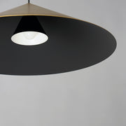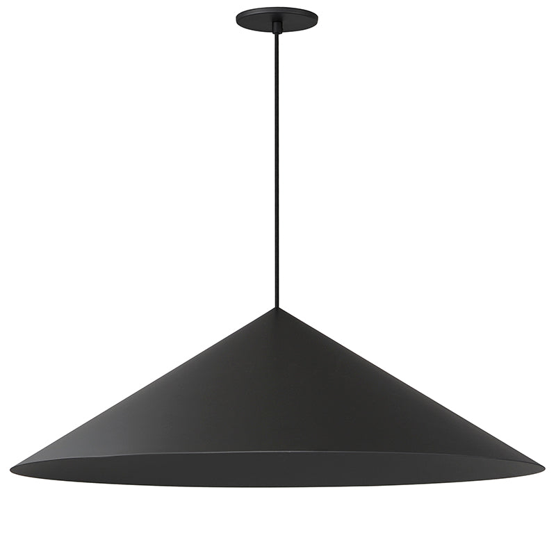 A surprisingly bright single light source is recessed within a secondary smaller aperture cone shade painted white on its interior to reflect more and beam additional lighting downward without glare. This distinctive cut off accentuates the black finish on the surfaces between two cones.