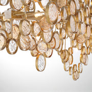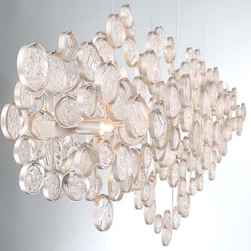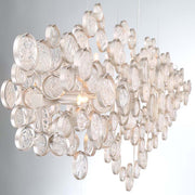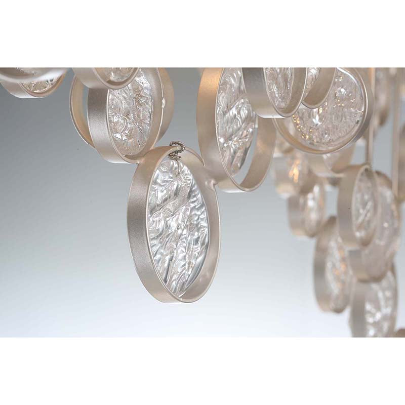 Intricate champagne silver metal wire frame adorned by delicately hand strung glass wafers.