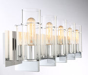 Clear glass cylinders featuring golden Edison bulbs exhibit a modern take on a vintage style.