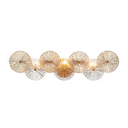 Grand robust detailing is showcased through exemplary glasswork. The pressed ribbed discs are each handmade intricately detailed and naturally tinted. These features add to the unique characteristics of each individual piece in this majestic collection.