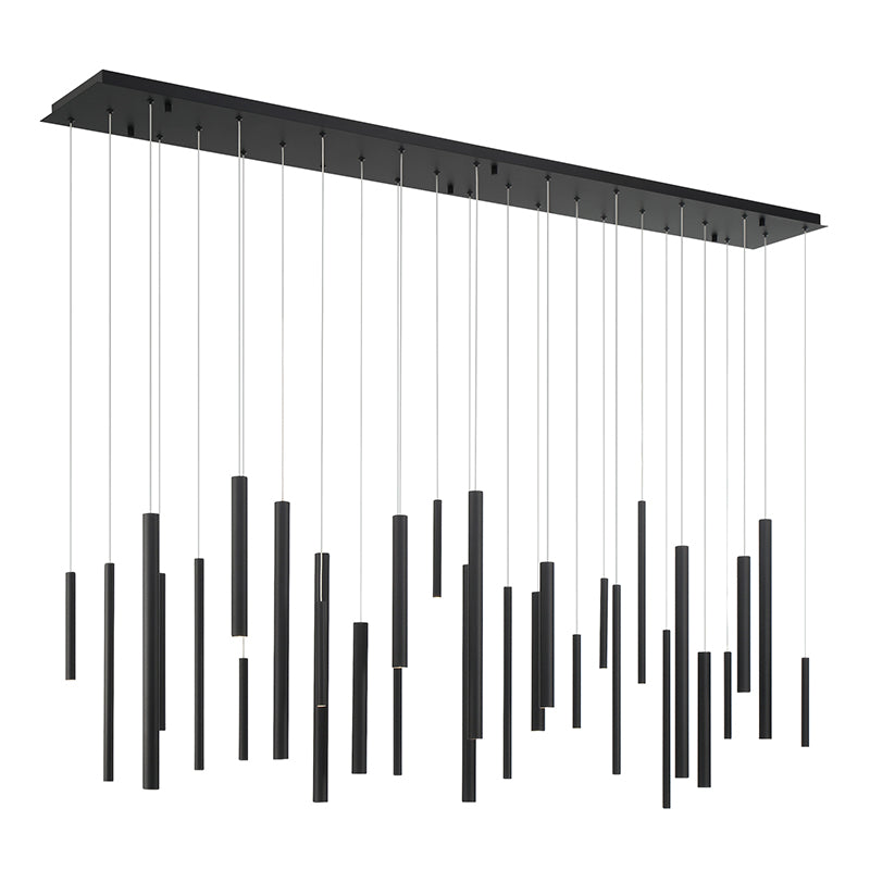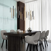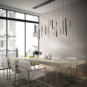An assortment of tubes suspend at different lengths and thicknesses to create a visually dynamic composition. The aluminum rodshouse LED lights at one end for collective spot lighting while adding a playful twist to its minimal design.
