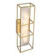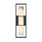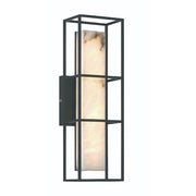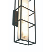 Organic and industrial have been combined. The softness of alabaster panels surrounded by the strength of a metal frame represent the yin and yang of a home…the warmth of the people safely ensconced inside the structural soundness of building, illuminated by Blakely wall mounted lighting.