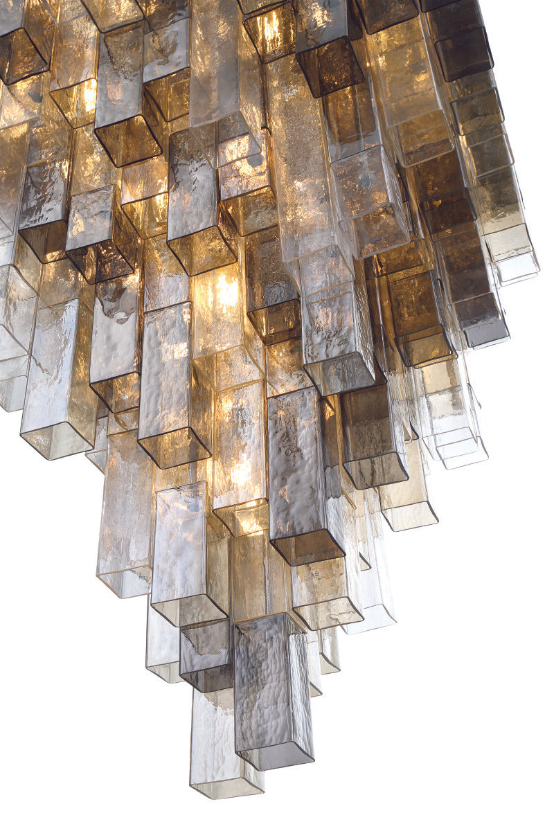 A series of stepped square balusters are the backbone of a staircase; adding grace and strength to a functional element in a building. Using this same tiered visual, Altesa dresses square frames with elongated square tubes of glass. The varying lengths, tones and densities of glass influence the depth and color of light, presenting a mesmerizing display in grand proportions.