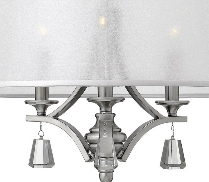This elegant collection in a Brushed Nickel finish features a sheer translucent double hardback shade and tapered square crystal accents.