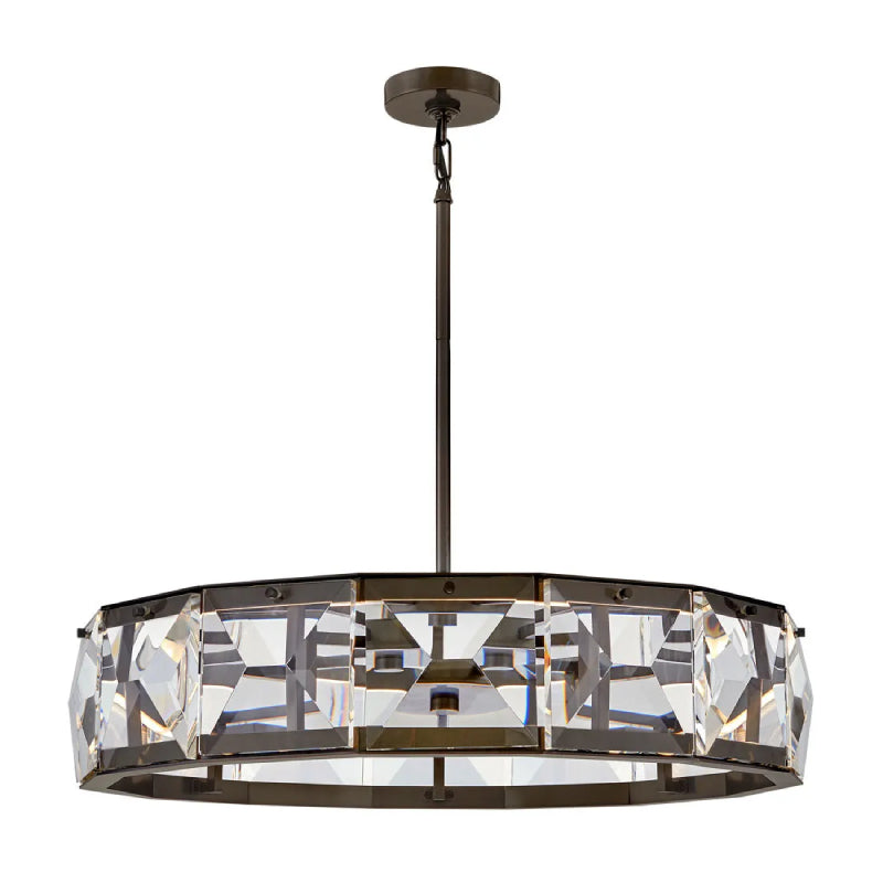 Jolie is a unique blend of sophistication, style, and technology. Integrated LEDs are sleekly concealed within gleaming Heritage Brass rings at the top and bottom of the design. Robust blocks of faceted crystal radiate with light, creating a transfixing silhouette while providing outstanding illumination.
