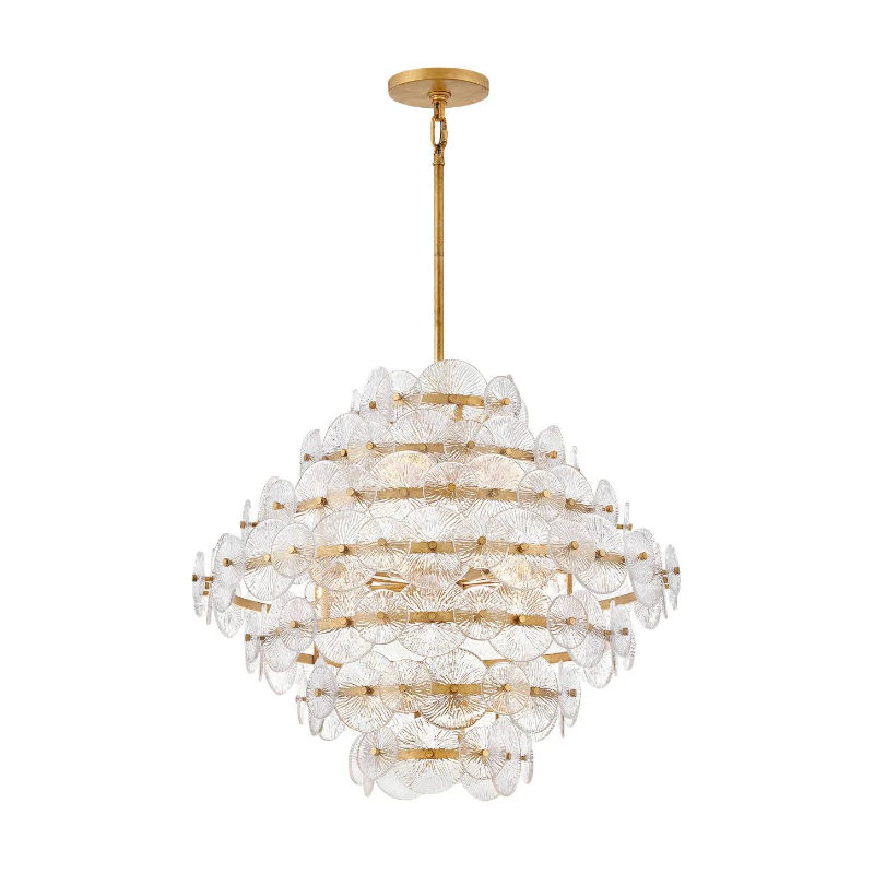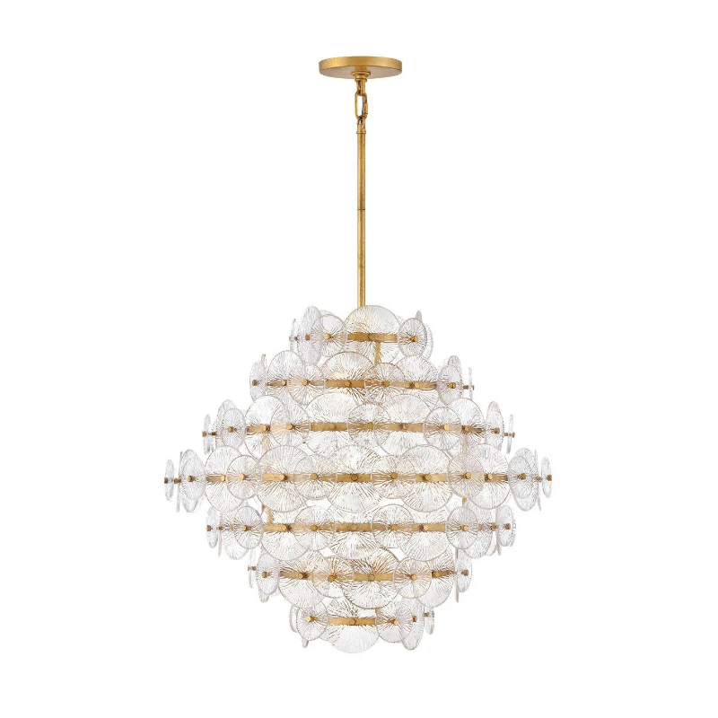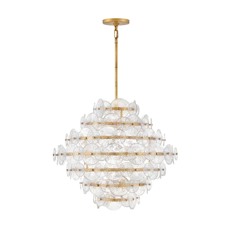 Rene radiates light through multiple layers of beautiful, pressed glass disks. Rene's signature touch highlights a Distressed Brass finish, evoking both transitional and glam influences.