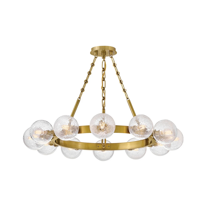 Dramatic crackled glass globes surround Coco’s timeless silhouette with unexpected, distressed detailing. Minimal framing suspended from decorative stem-to-chain uprights features a warm and inviting Lacquered Brass finish.