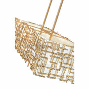 Farrah's contemporary design is bold and sculptural, while achieving an optical airiness. The hand-hammered crosshatch bars gleam in a hand-applied Silver Leaf or Burnished Gold finish with artisanal detailing that carries through to the canopy detail. Set against a White Linen shade, Farrah creates a look of deconstructed; modern elegance.