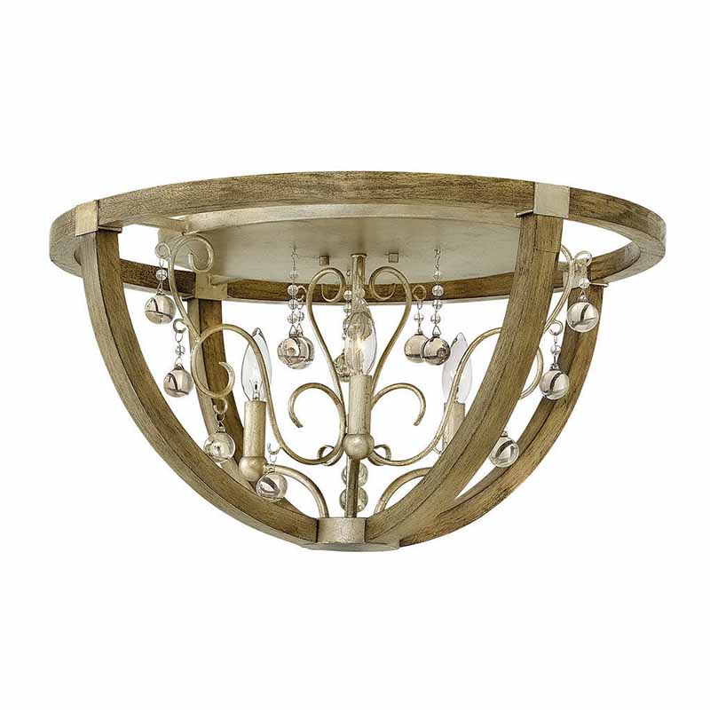 Rustic yet sophisticated, Abingdon finds inspiration in the charm of a European country chateau. Integrating raw and refined materials, a modest open globe of Weathered Ash wood is accented by the chic patina of Silver Leaf banding. An intricate interior chandelier is composed of scrolled arms and solid glass champagne drops for a luxe, timeless appeal.
