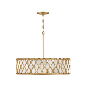 Opulently adorned with natural alabaster stones held within a traditional latticework shade, Estie brings organic elegance to any aesthetic. Intricately curved metalwork complements the frame, chain, and canopy in a textured Piastra Gold finish.