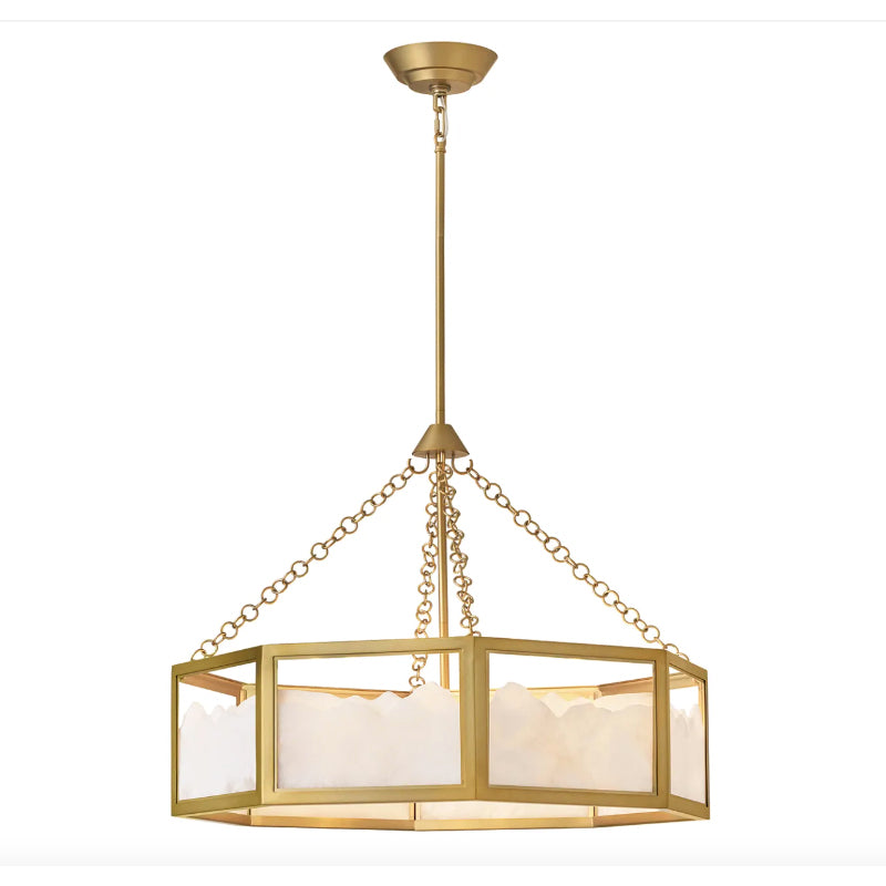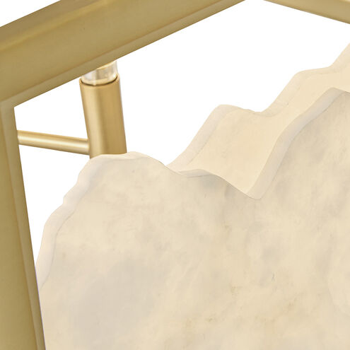 Inspired by snowy mountain peaks, Veleta’s natural alabaster shade with jagged top edges is showcased by a geometric Lacquered Brass frame. Truly one-of-a-kind graining, color variations, and organically formed textures make each Veleta fixture genuinely unique.