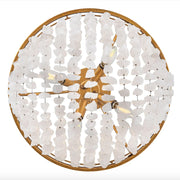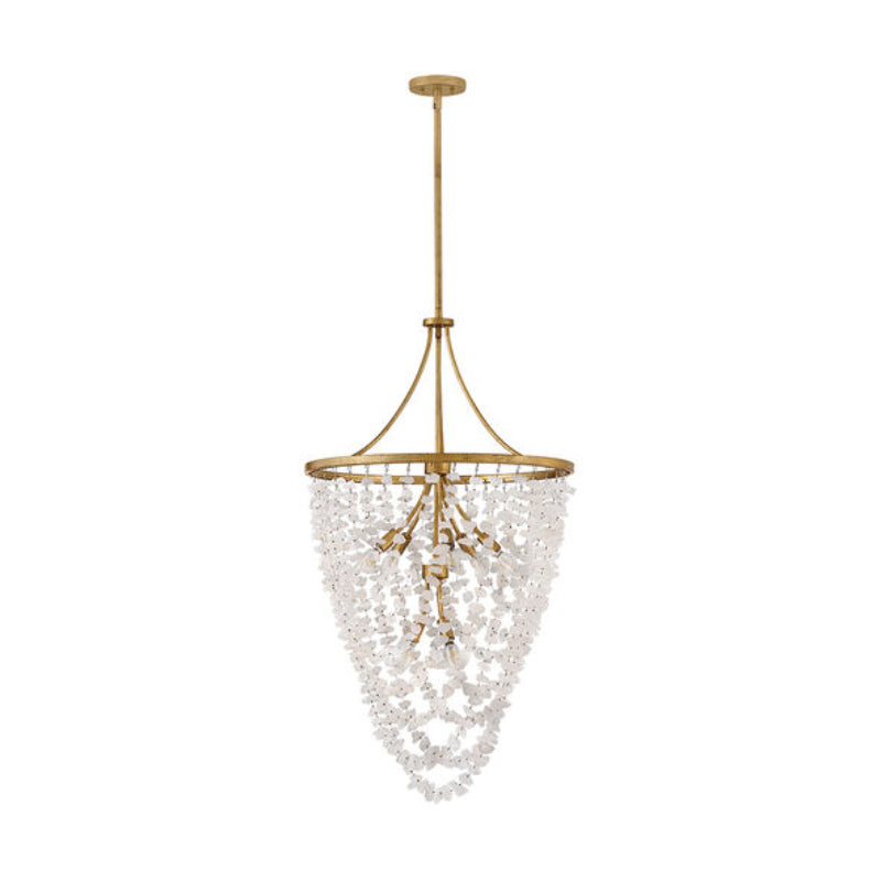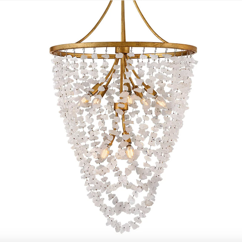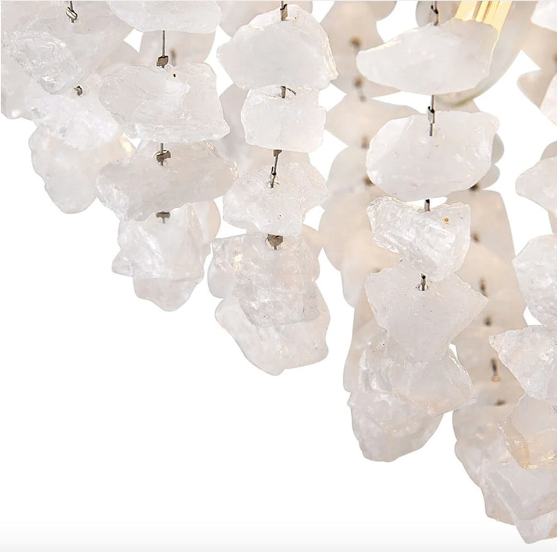 Glamorous strands of rock crystal hang delicately from Myra’s gold-toned Distressed Brass frame, creating a beautiful curtain of uniquely shaped stones. Each naturally formed facet reflects light from elegant, dimmable candelabra lamps.