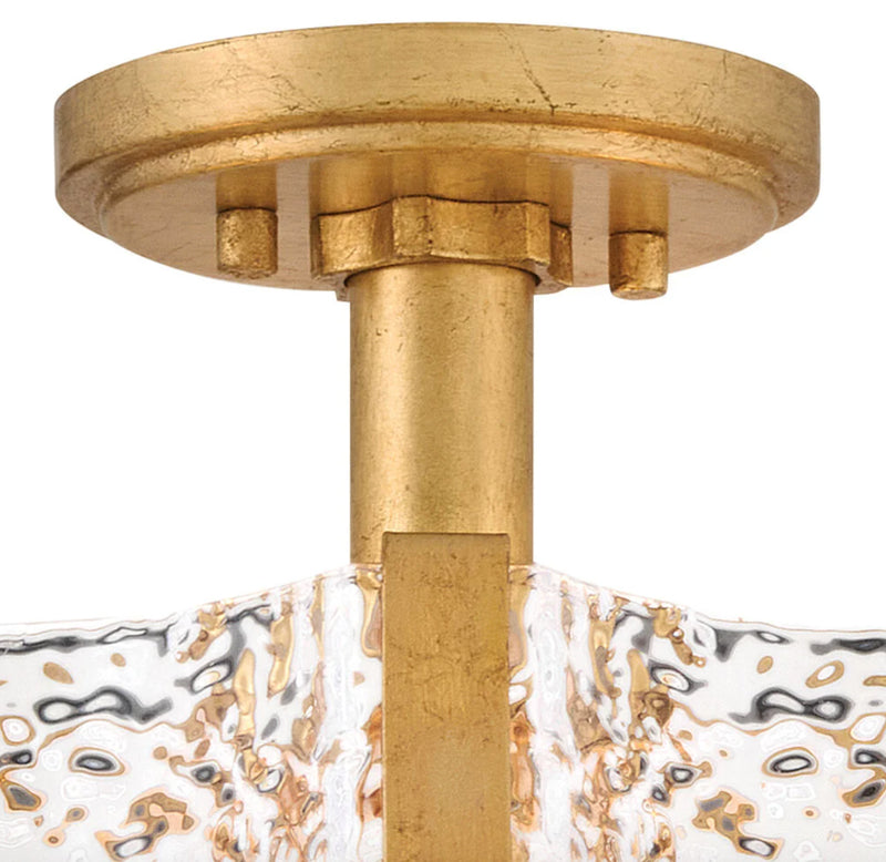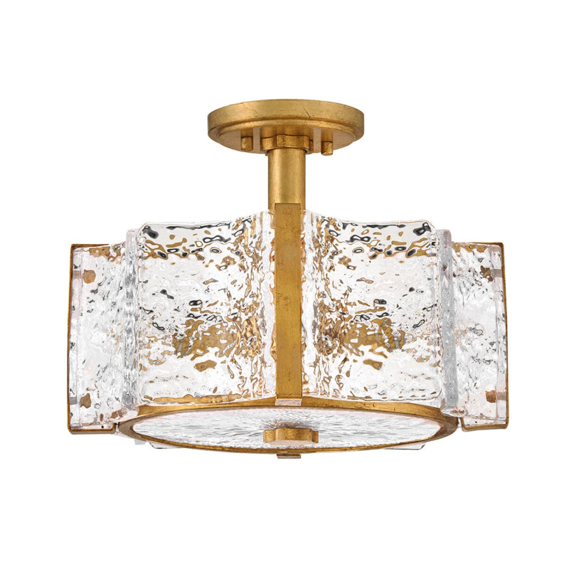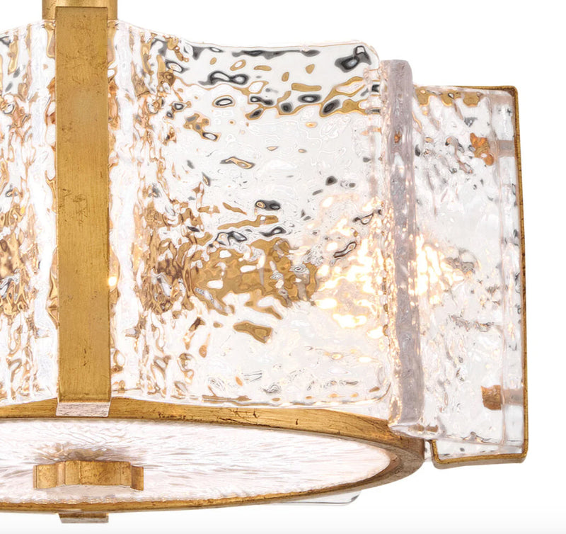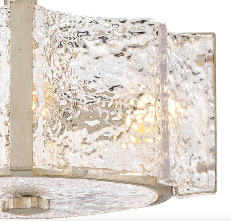 Exquisitely styled with a flowing, crystalline appearance, Florian’s clear pressed glass shade creates an almost aqueous illusion with a subtle texture that gently diffuses light from warm candelabra lamps.