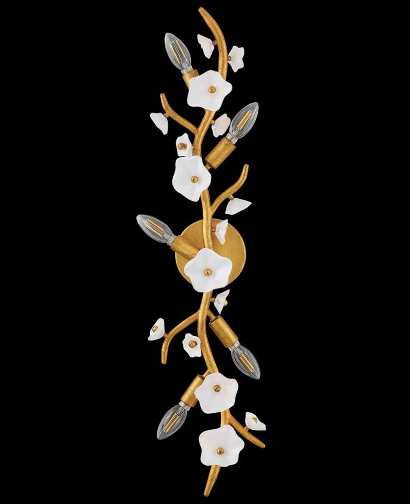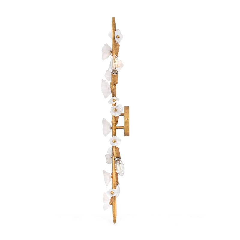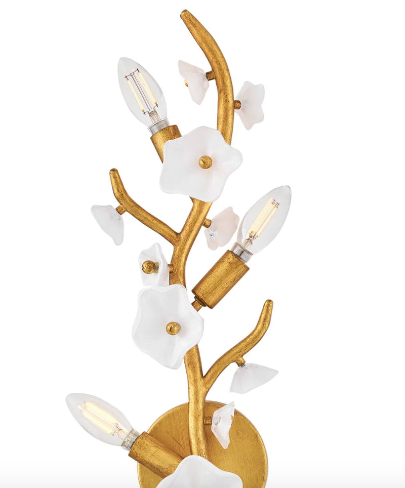 Inspired by the natural romance of annual spring blooms, Azalea’s intricate silhouette is adorned with double-layered glass blossoms crafted from clear and white glass.