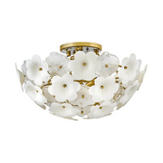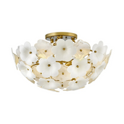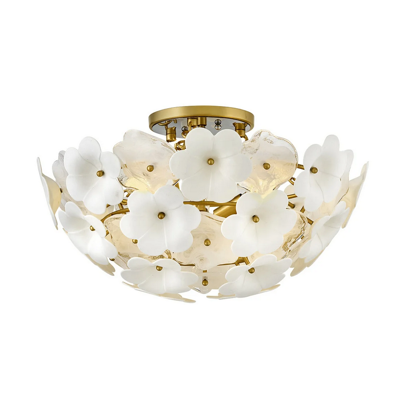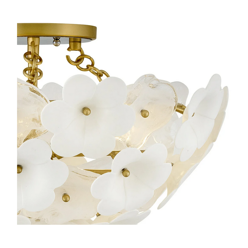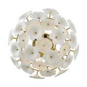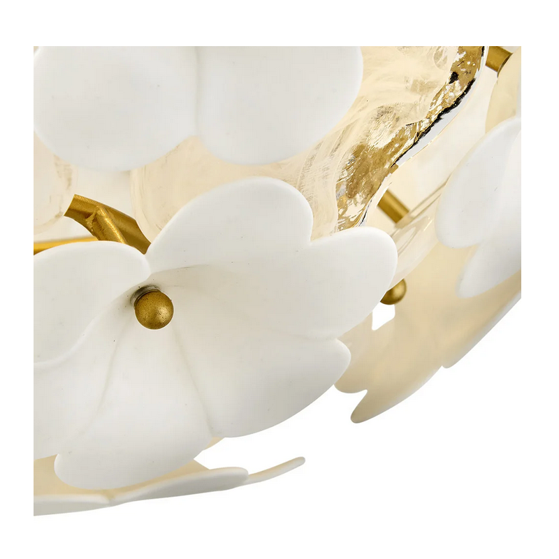 Decadently arranged in glamorous clusters, Marianne’s wispy-patterned white glass and ceramic blossoms create an elegant organic silhouette enhanced by a luxurious glow. Intricate frames in our Deluxe Gold finish capture warm inviting illumination.