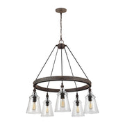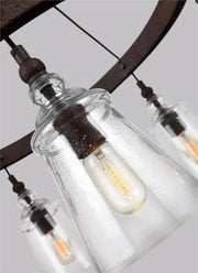The Loras collection from Feiss is a contemporary take on historic, industrial designs. The transitional chandeliers feature multiple corded pendants beautifully suspended on to a Dark Weathered Iron-finished frame. Clear Seeded glass shades add more rustic charm to this vintage-inspired silhouette, and the black fabric cord adds a clean, contemporary design feature to create contrast and update the look. Through the clear glass shades, the exposed bulbs are central to the design theme, so Edison-style bulbs are a perfect choice. Perfect for rustic, traditional inspired décor.