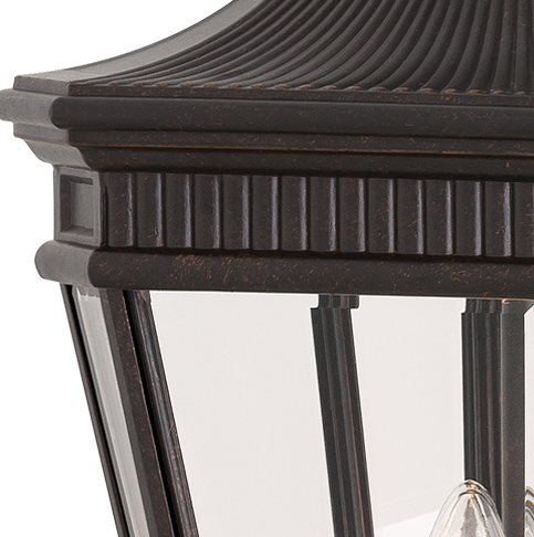 The traditional, antique gas lantern-inspired design of the Cotswold Lane Collection features dentil molding at the top of each pane of beveled glass. Cotswold Lane's profile is timeless and elegant.