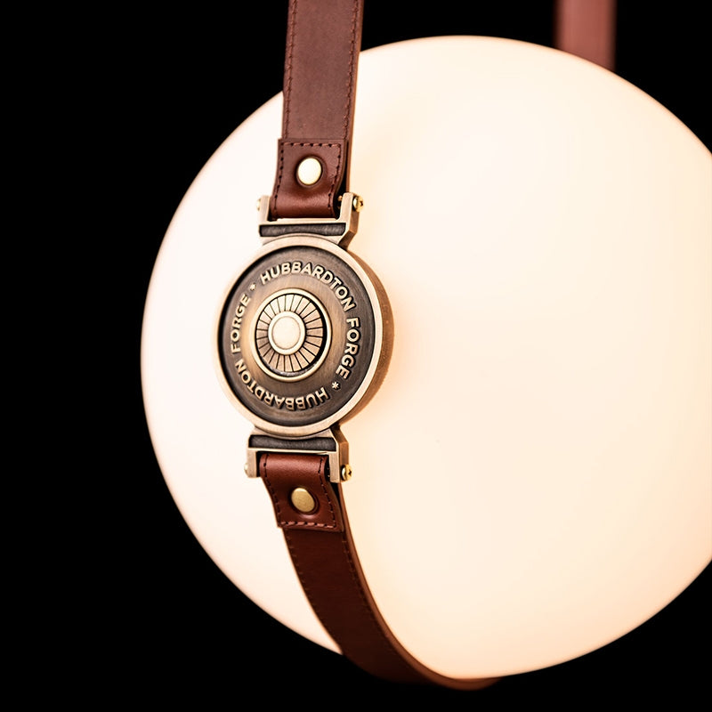 Hung singly over a night table, or in multiples over a kitchen island or bar, the Derby Small Pendant is as intriguing as it is simple. Handcrafted leather straps from a local New England artisan, featuring beautiful brass fasteners and buckles, suspend a single 10" glass sphere encasing an LED lighting element..