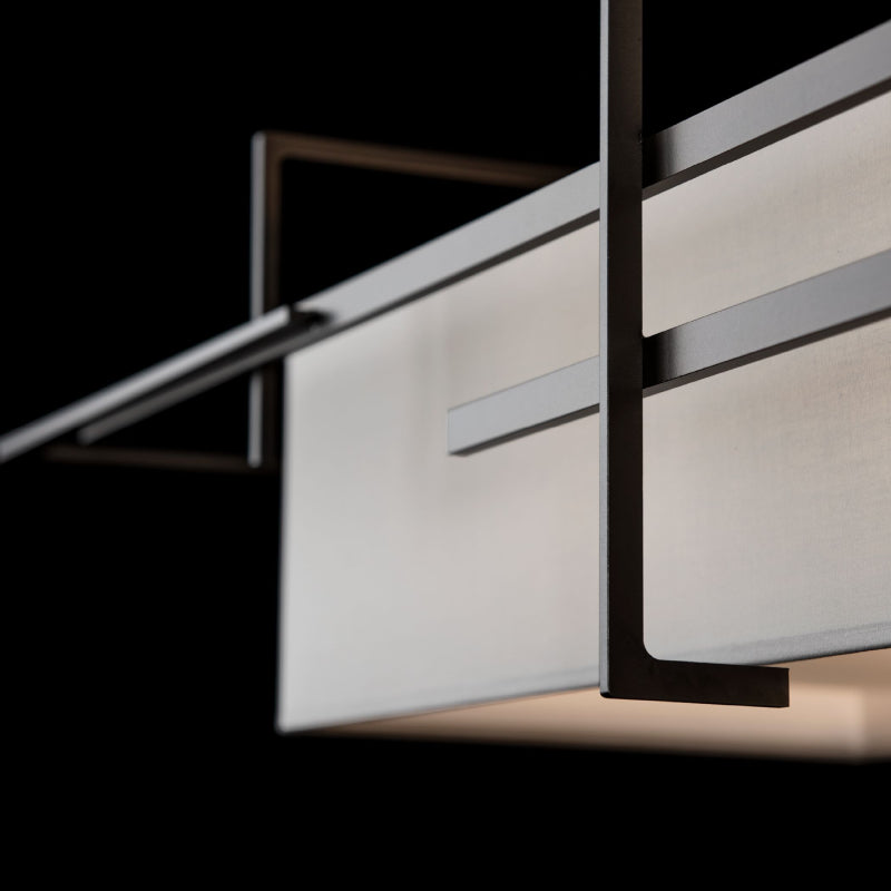 A modern take on a classic form, the Etch Pendant is full 54” in width. A classic, rectangular shade is held within an abstract, Mondrian-esque hand-forged steel exoskeleton with clean lines and angles. An impressive and versatile lighting pendant is suited to a variety of design styles.