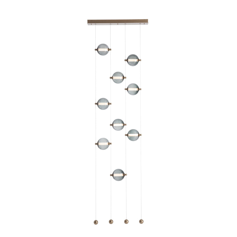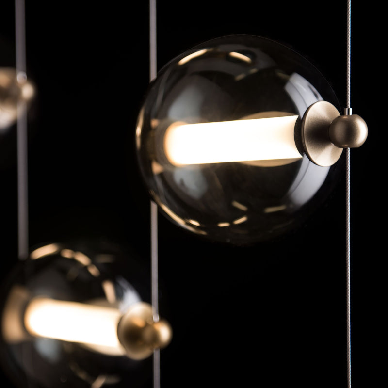 The Abacus can be customized by moving any of the nine blown glass globes up or down its low-voltage cable "rail", by virtue of tiny grippers on each side that when squeezed, free the globe to slide and stop, exactly where you want to position it. Small steel balls anchor each cable.