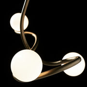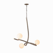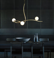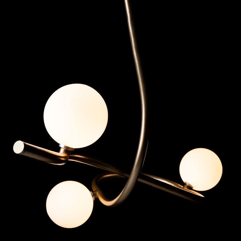 The Slide Pendant is a statement piece in any space. Almost 4' in width, a fluidity of shape and movement is created by the sensual curves of the metal that seems to balance 3 opal glass globes. As beautiful as it is functional, the Slide Pendant provides light and grace to enhance its environment.