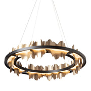 This magnificent and dramatic Hildene Circular pendant, with its crafted hills and valleys creating shadow and light, is a focal piece in any space. Part of the Hildene Collection, this large pendant's curved metal plates are awash in up-and-down light emanating from the LED lightguide encased in its circular frame.