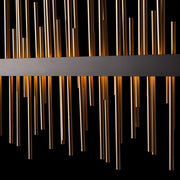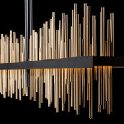 The linear Gossamer Pendant Large is suspended by two central rods. A multitude of thin, steel rods pierce the LED lightguide that is encased in its frame, creating a wash of up-and-down light.
