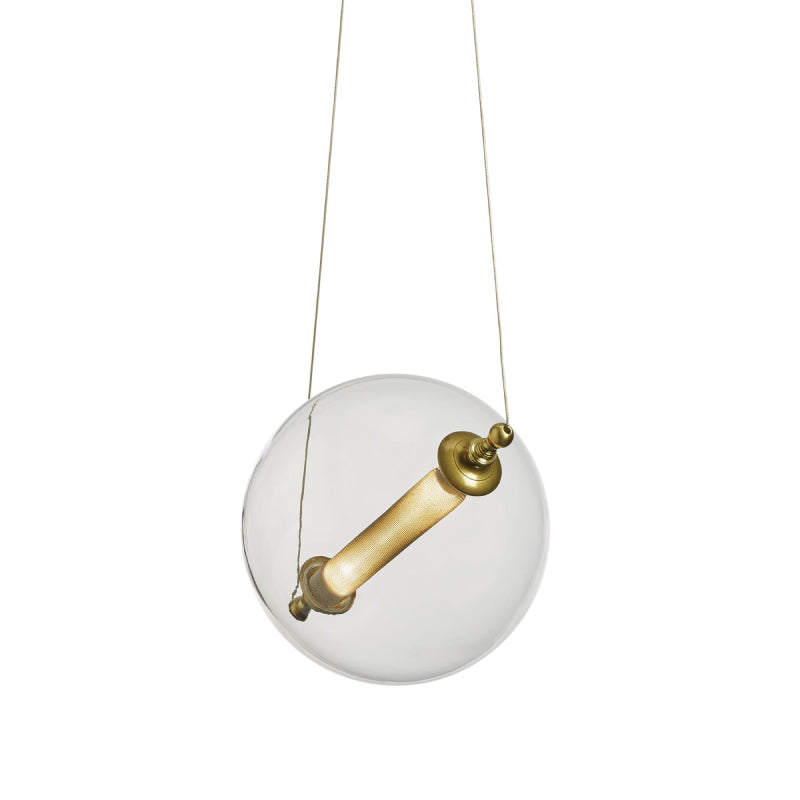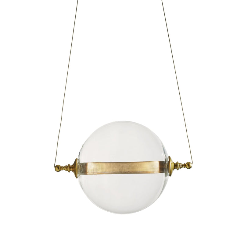 Bold and brassy, this mini pendant makes an impact. By adjusting the cables, the light element can be positioned horizontally or at an angle. The inner diffuser is a stainless steel mesh and glass.