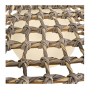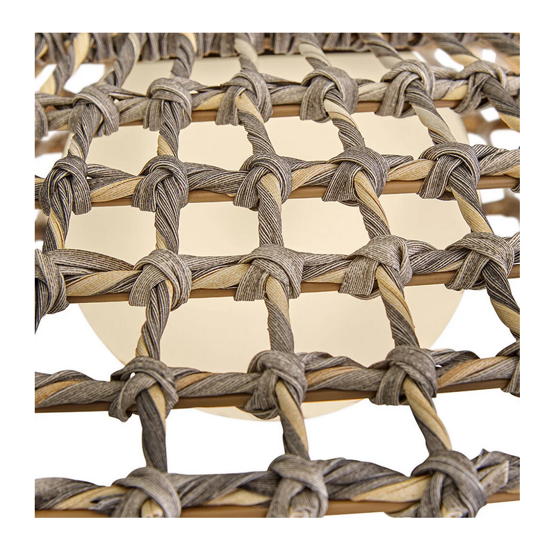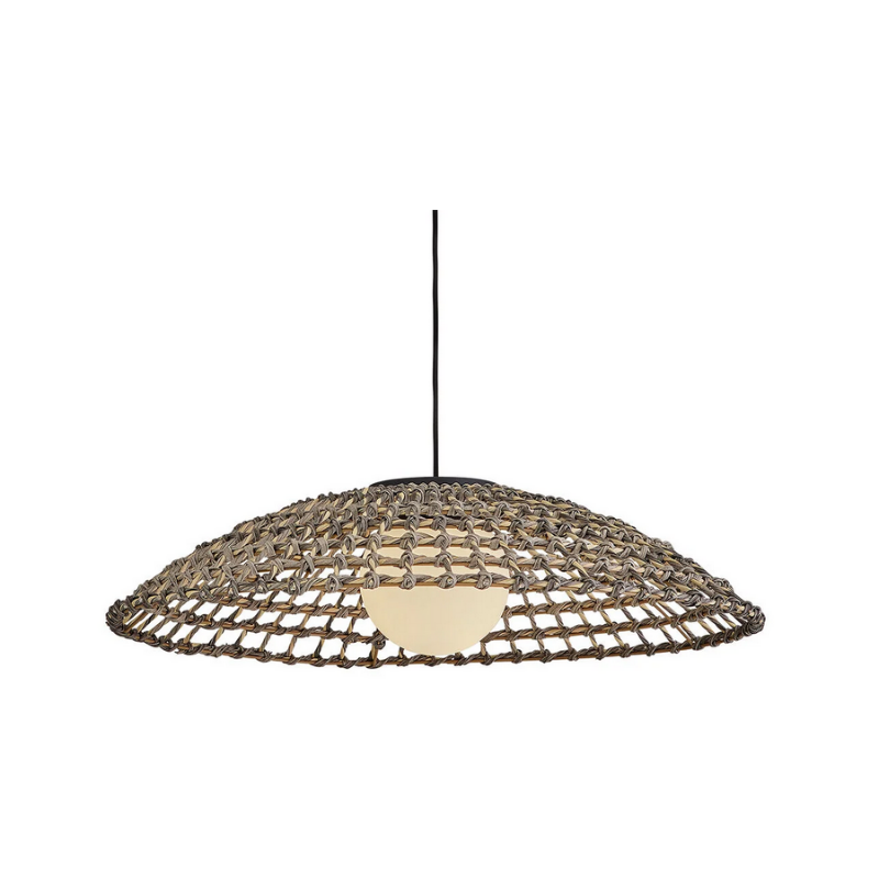 Cool and coastal-inspired, Arlen features a woven, all-weather rattan shade perfect for entertaining in al fresco dining spaces. The natural texture and neutral tones are complemented by a chic black canopy.