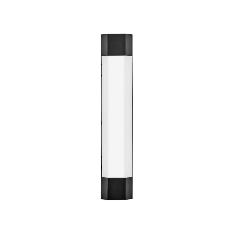 View the many sides of Facet. Interesting angles combine with bold metal features to create an edgy and contemporary profile that is unpretentious yet unforgettable. Hexagonal etched white glass is showcased by a bold Black finish.