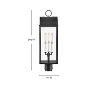 Inspired by traditional colonial lanterns, Campbell’s carriage house styling complements classic architecture accentuated by a bold arched roof and a cast top ring. Candelabra lamps with contrasting candle sleeves are enhanced by a Black with Burnished Bronze finish.